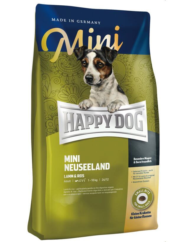 「ミニ ニュージーランド」は、消化吸収にすぐれた新鮮で健康的なラム肉 (21%)、米 (21%)、栄養豊富な緑イ貝に、健康な体づくりに必要なオメガ3、オメガ6脂肪酸を豊富に含むひまわり油と菜種油、厳選したナチュラル食材をバランスよく組み合わせ、こだわりのレシピで極上の美味しさを実現しました。特におなかの弱い小型犬のためのスペシャルレシピです。使用している動物性タンパク質はラム肉のみです。